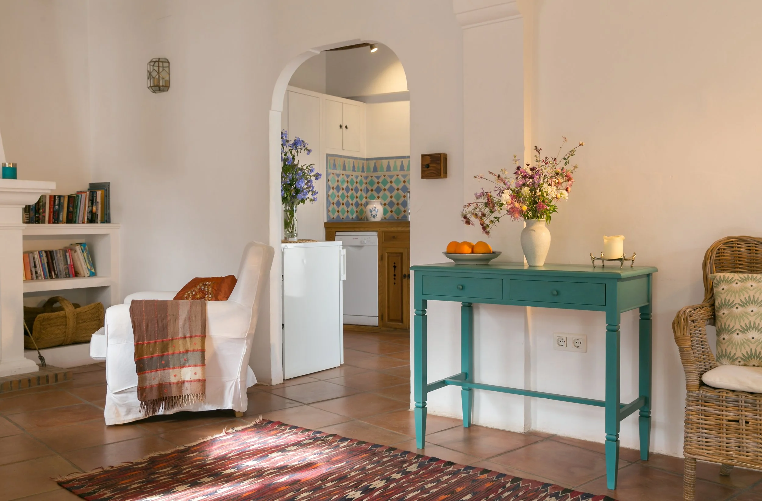 In the bedrooms we’ve kept the original chestnut beams with white walls and terracotta floors, comfortable beds, quality linens and a scattering of rugs.
